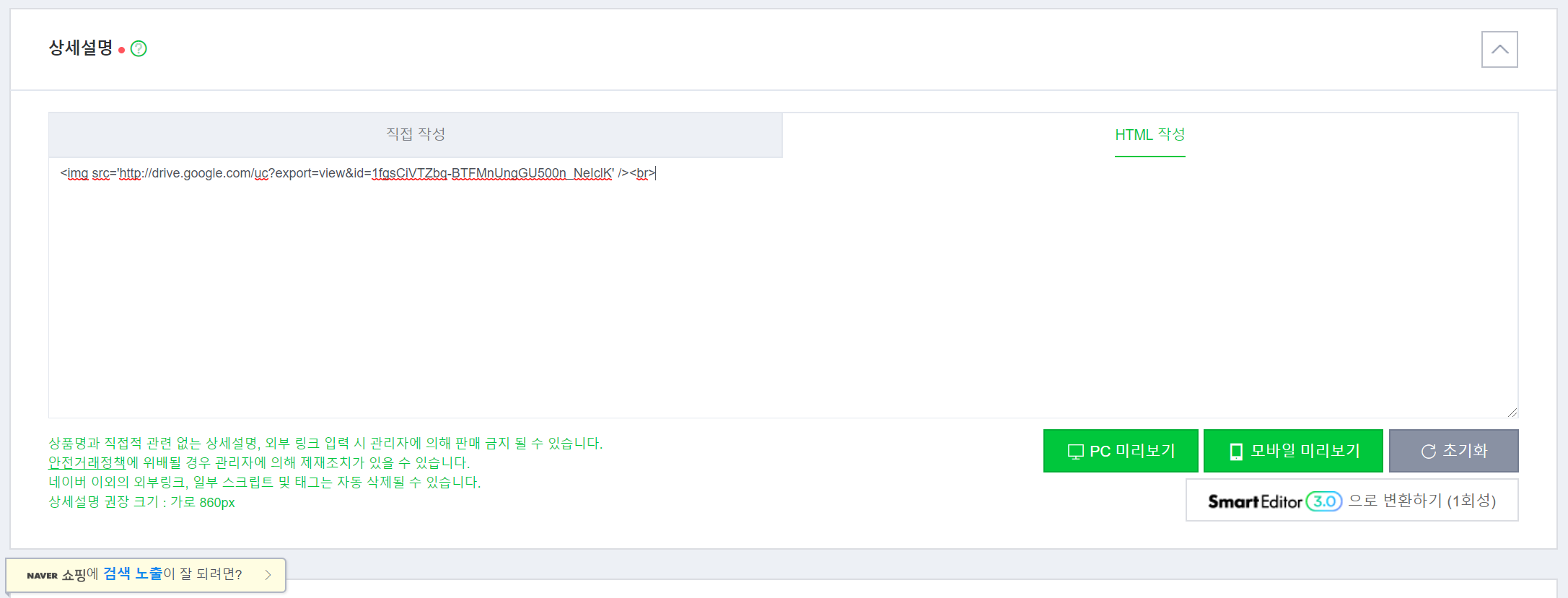 (html로 작성해도 쇼핑몰 자체 서버에 이미지를 저장하는 경우는 불가 합니다/예 : 쿠팡)