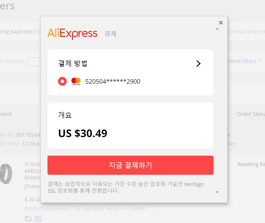 알리익스프레스는 총 4가지 결제 방법이 있으며, 우리나라 구매 시에는 보통 카드 결제(마스터/비자/아메리칸 익스프레스 등)로 진행하실 것이라 생각됩니다.