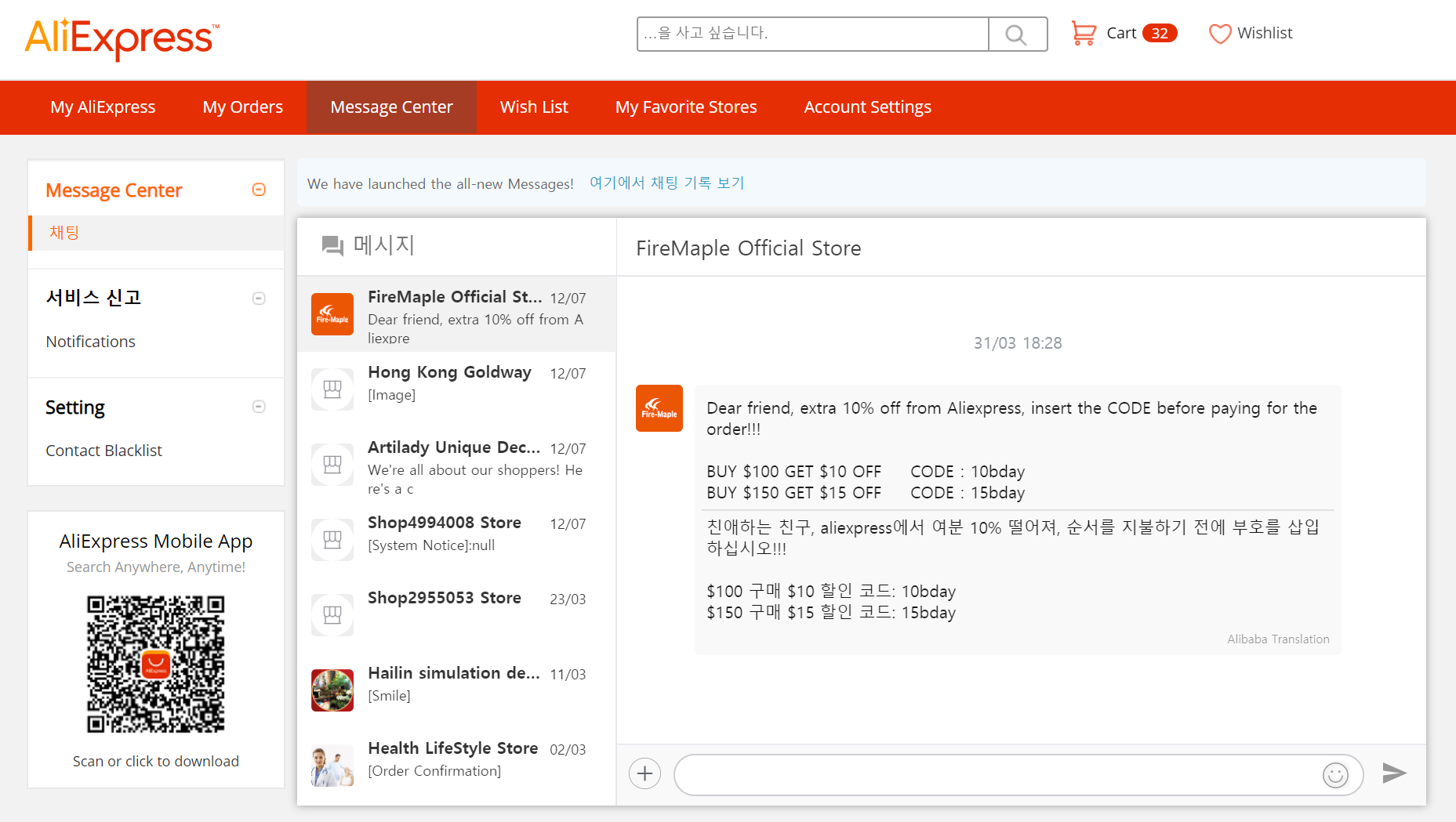 과거 알리익스프레스의 메신저 서비스는 일일이 구글 번역기 등을 통해 서로 영문으로 번역을 해가며 판매자와 구매자가 소통을 하였는데요. 최근 들어 알리바바 자체에서 번역 기능을 메신저 센터에 추가함으로써 한글로 채팅을 치더라도 판매자에게는 자동으로 번역이 되어 서로 대화하는 것이 더욱 편리해졌습니다 :)