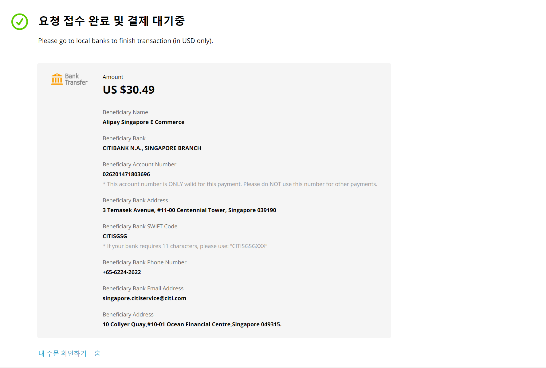 송금이나 웨스턴 유니온은 주문을 신청 후에 별도로 구매자가 직접 해외송금을 하거나 웨스턴 유니온으로 결제를 진행해야 하기 때문에 우리가 실결제를 하지 않으면 주문만 들어가고 결제 대기(Awaiting payment) 상태로 진행하실 수 있습니다.