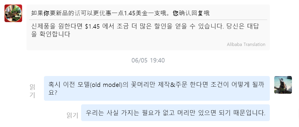 채팅 내용은 그냥 편하게 "나 이런 상품을 사고 싶은데 혹시 조금 저렴하게 구매할 수 있을까? 한 5% 정도면 바로 구매할 수 있을 거 같아" 등 한글로 물어보시면 판매자가 확인 후에 답변을 해줄 겁니다. 1~2개 구매하는 것은 할인 요청을 거부할 수도 있으나 다량의 상품을 구매하시거나 조금 할인하는 정도는 생각보다 쉽게 성공하실 수 도 있습니다^^