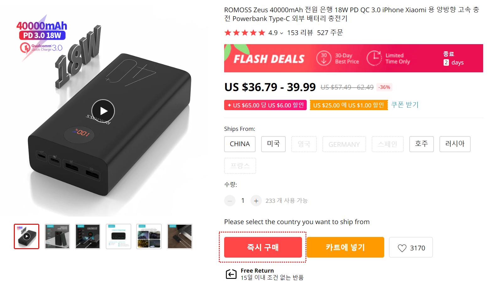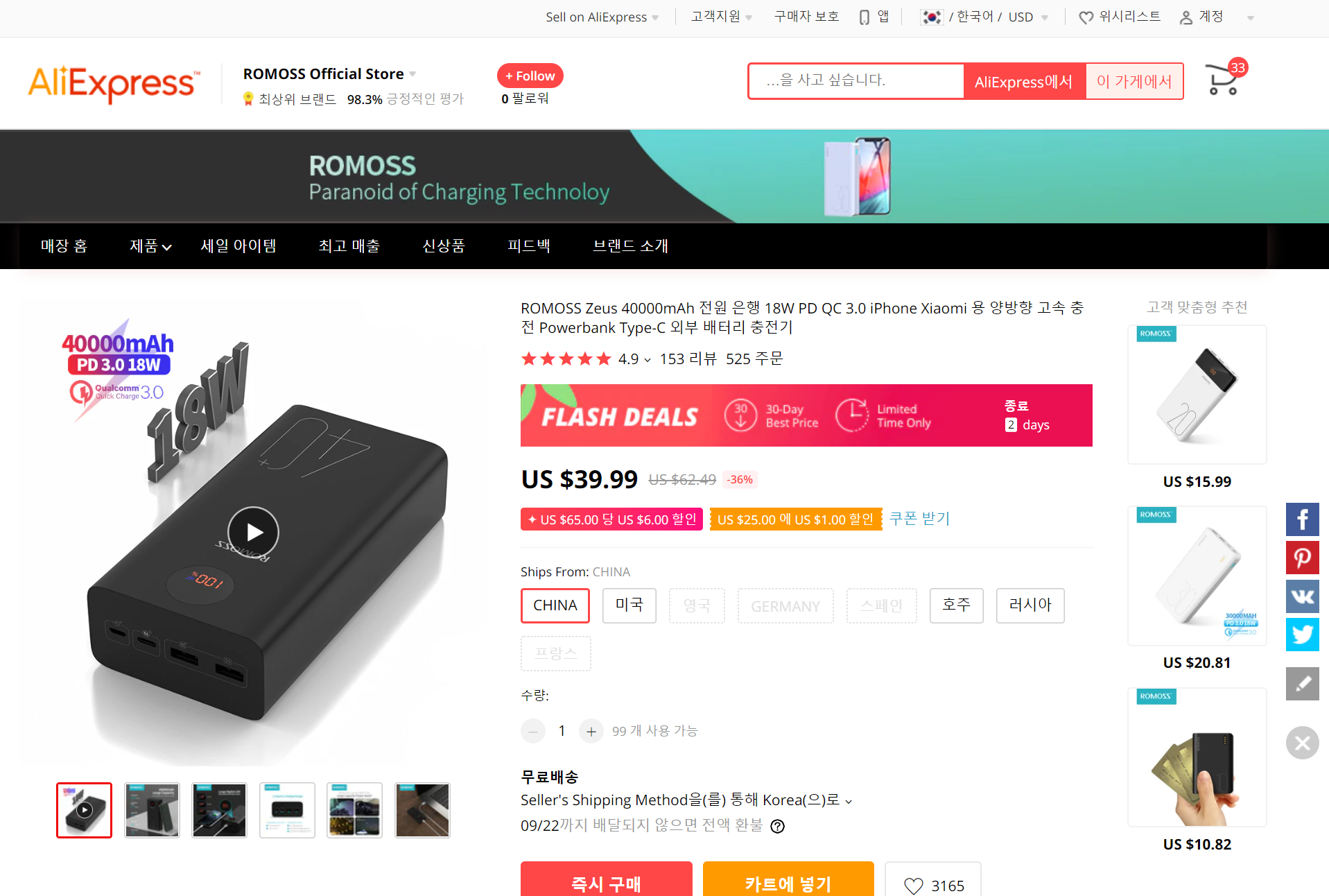 일단 구매를 원하시는 상품페이지로 이동을 하셔야 합니다. 예시로 보조배터리를 들어보도록 하겠습니다.