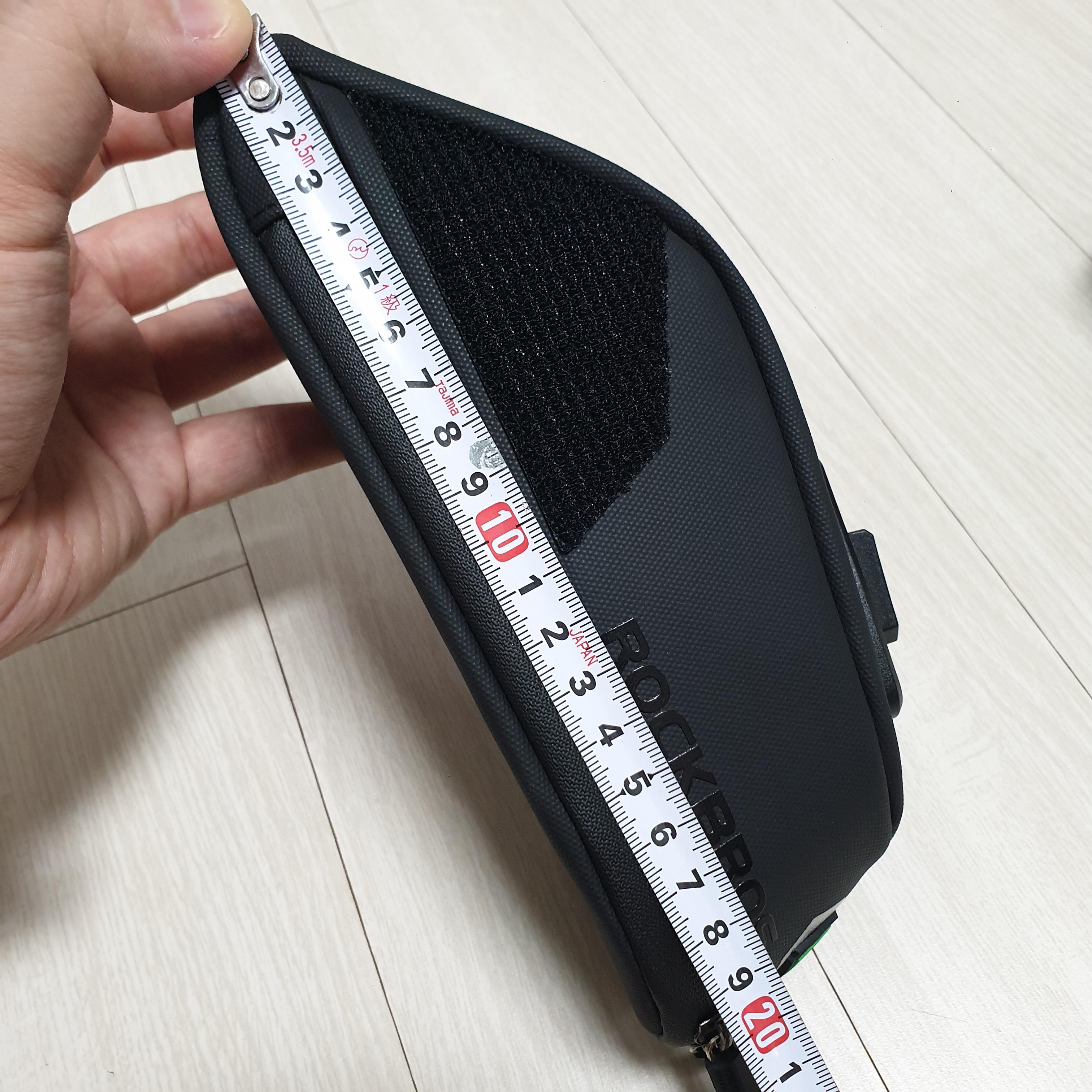 제조사에서 공시한 락브로스 자전거 방수 안장 가방(C27-1 : C27의 M사이즈 입니다.)의 크기는 가로 21cm, 넓은 부분(개폐되는 부분)의 세로 길이는 8.5cm, 싯포스트 부분의 세로 길이는 8cm였습니다.