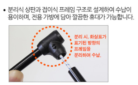 그리고 접이식 프레임은 흔히들 텐트 폴대에서도 보셨을만한 두랄루민(7001) 소재로 제작되었기에 내구성이 뛰어나다고 보시면 됩니다.