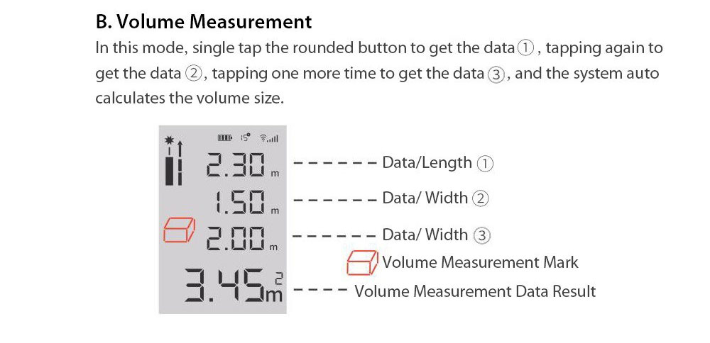 13. 부피 측정 기능 : 정면 버튼으로 가로, 세로, 높이까지 총 3번을 측정하여 부피를 측정합니다.(최하단에 ㎥로 표기)