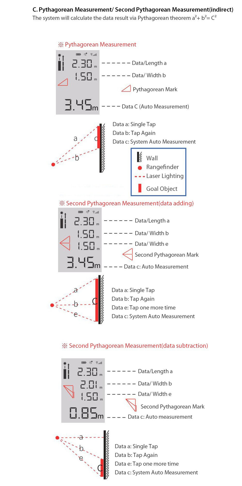 14. (이중)피타고라스 거리 측정 기능 : 피타고라스 공식(a²*b²=c²)을 바탕으로 (이중)피타고라스 거리 측정을 합니다. 총 3가지 방법으로 각 상황에 맞게 측정하시면 됩니다.(각도를 맞추어야 측정이 되며 각도에 맞지 않는 경우 정상적인 계산이 되지 않습니다.)