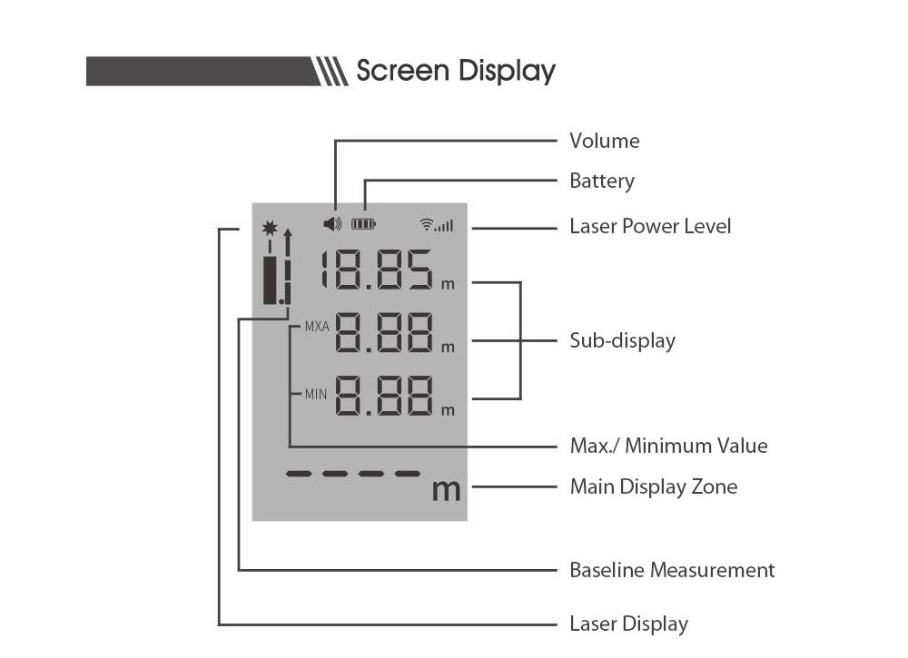 1. 화면 창의 가장 윗 면에는 볼륨/배터리/레이저 신호 세기가 표시됩니다.(거리 측정이 정상적으로 되지 않는 경우 '레이저 신호 세기'를 확인하여 주세요.)