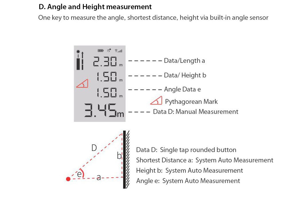 15. 각도 측정 기능 : 피타고라스의 정리를 활용해 각도와 높이를 측정합니다. 상단 이미지의 'Angle Data'부분에 이미지와 달리 각도가 표시됩니다.(액정 화면에 각도가 정상적으로 표시될 때 활성화 됩니다. 한 번 눌러 위 이미지의 'D' 지점을 측정해주면 각도와 높이, 거리를 모두 자동으로 계산해 줍니다.(측정기가 수평에 있음을 기준으로 측정)