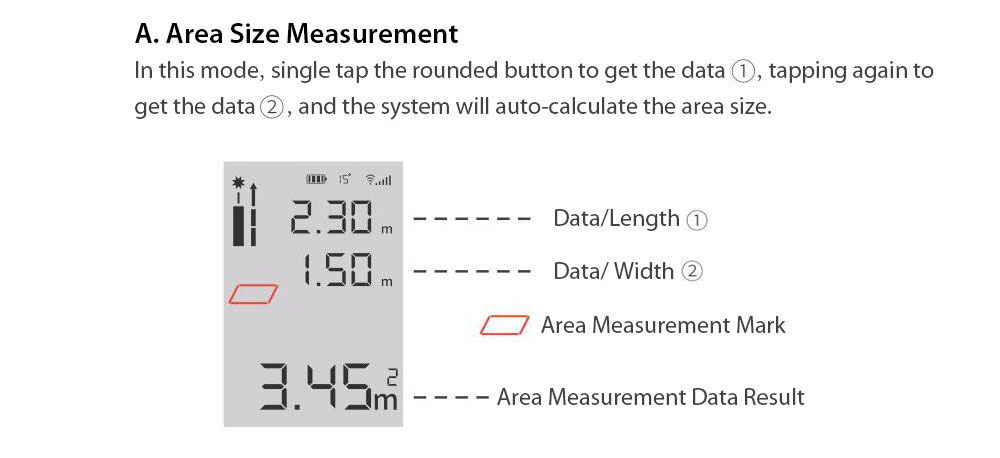 12. 넓이 측정 기능 : 해당 기능 모드를 선택한 후, 정면 버튼을 한 번 눌러 가로 길이 측정, 다시 한 번 눌러 세로 길이를 측정해 해당 면적을 구합니다.(최하단에 ㎡로 표기)