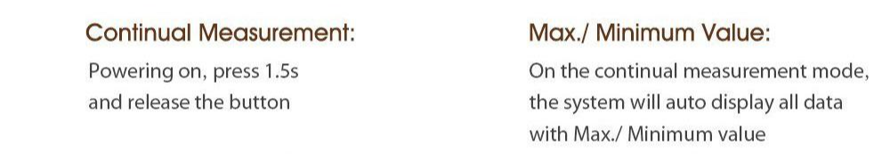 8. (전원이 켜진 상태에서) 정면 버튼 3초 클릭 : 실시간 연속 측정 기능(MIN, MAX)이 표시되고 없어지면서 측정 기준(측정기 포함 또는 미포함)이 변경됩니다.